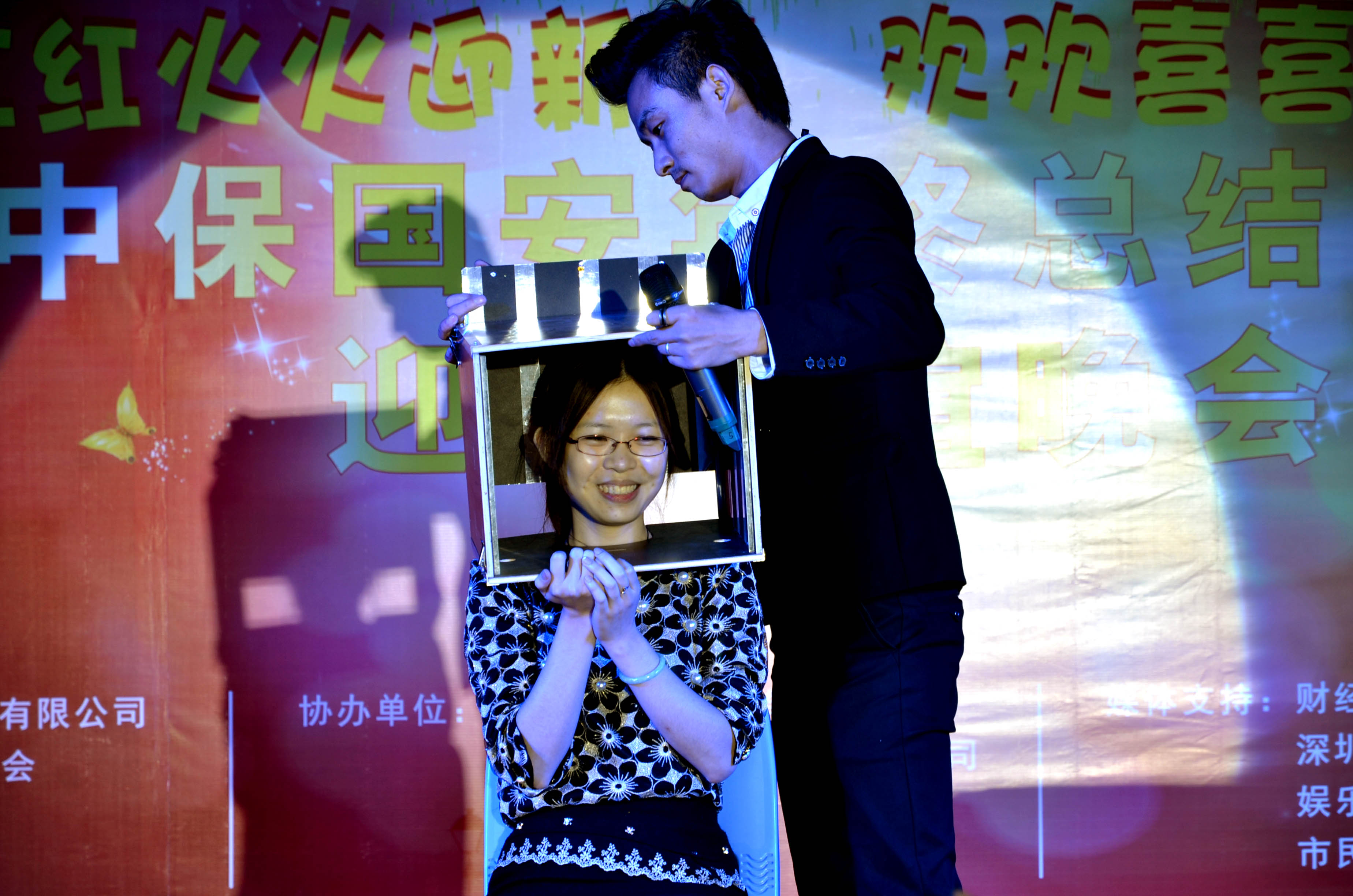 公司MM上台配合魔术师表演