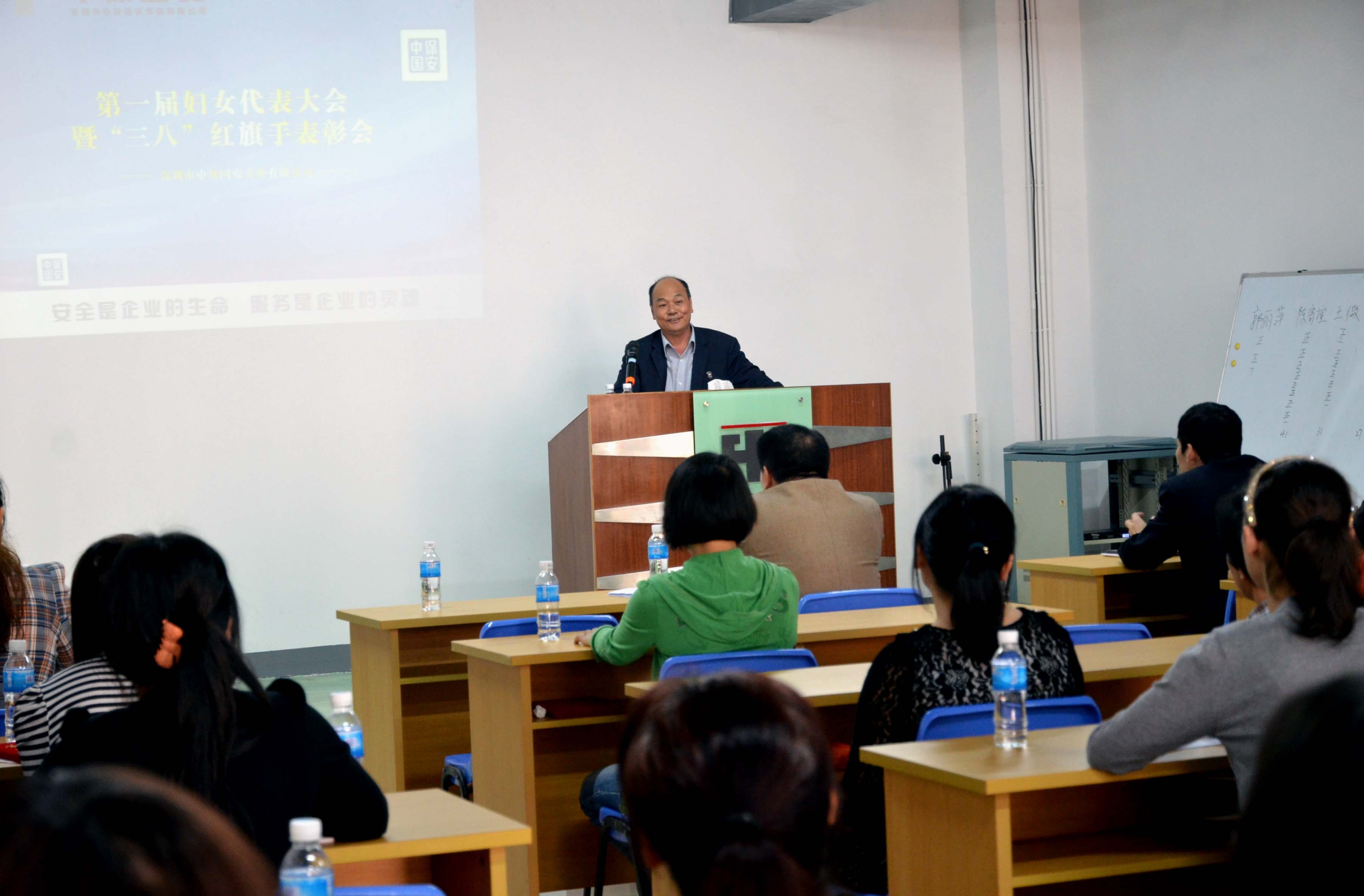 会上,毕少东副总经理宣读公司首届“三八红旗手”表彰决定。行政部王微、财务部陈楚芬、保安事业部张润媛、中保比讯林文洁、培训中心侯冰霞、中鹏分公司盛晓密、中安分公司李小艳、中南分公司林仕云八人光荣当选。人力资源部经理徐杰宣读了《妇女委员会工作制度》。经过认真讨论,妇女代表大会选举产生了公司首届妇女委员会,陈寄谊当选为妇女委员会主任,王微、何青艳当选为妇女委员会组织委员、宣传委员。冯道宽董事长发表讲话,对公司全体女同胞致以节日的问候,对女同胞们为公司的发展壮大所发挥的积极作用表示感谢,对选举产生的首届妇女委员会和 “三八红旗手”表示祝贺。最后,董事长阐述了成立妇女委员会的目的和意义,希望女同胞们继续保持认真务实的工作态度,在工作中不断提升自己,在平凡的岗位上做出不平凡的业绩,弘扬女性“自尊、自信、自强、自立”的时代精神。