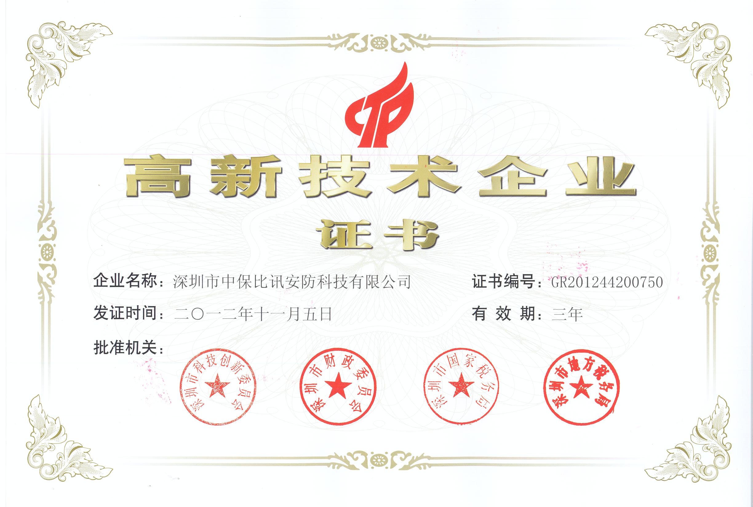 近日,深圳市中保比讯安防科技有限公司顺利通过国家级高新技术企业认定,获得由深圳市科技创新委员会、深圳市财政委员会、深圳市国家税务局、深圳市地方税务局联合颁发的《高新技术企业证书》(证书编号:GR201244200750)。