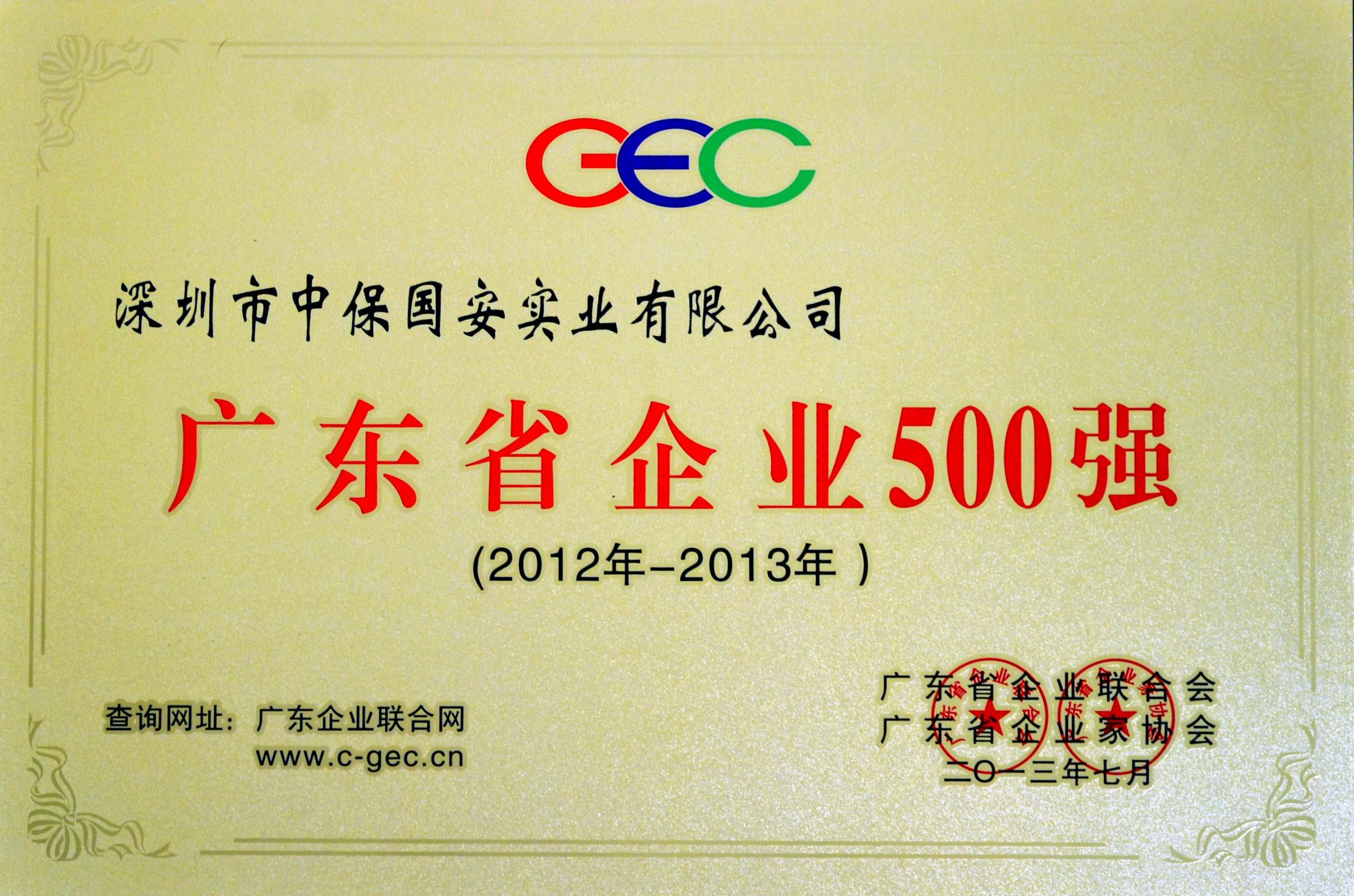 此次评选由广东省企业联合会、广东省企业家协会在过去九年评选的基础上,参照国际通行的做法,以2012年企业营业收入为基本标准,综合考核企业各方面条件,经审核委员会审定、评选出来的。深圳市中保国安实业有限公司凭借自身的优势,最终取得了2013年广东省企业500强第452名、2013年广东省服务业百强企业第70名的成绩。