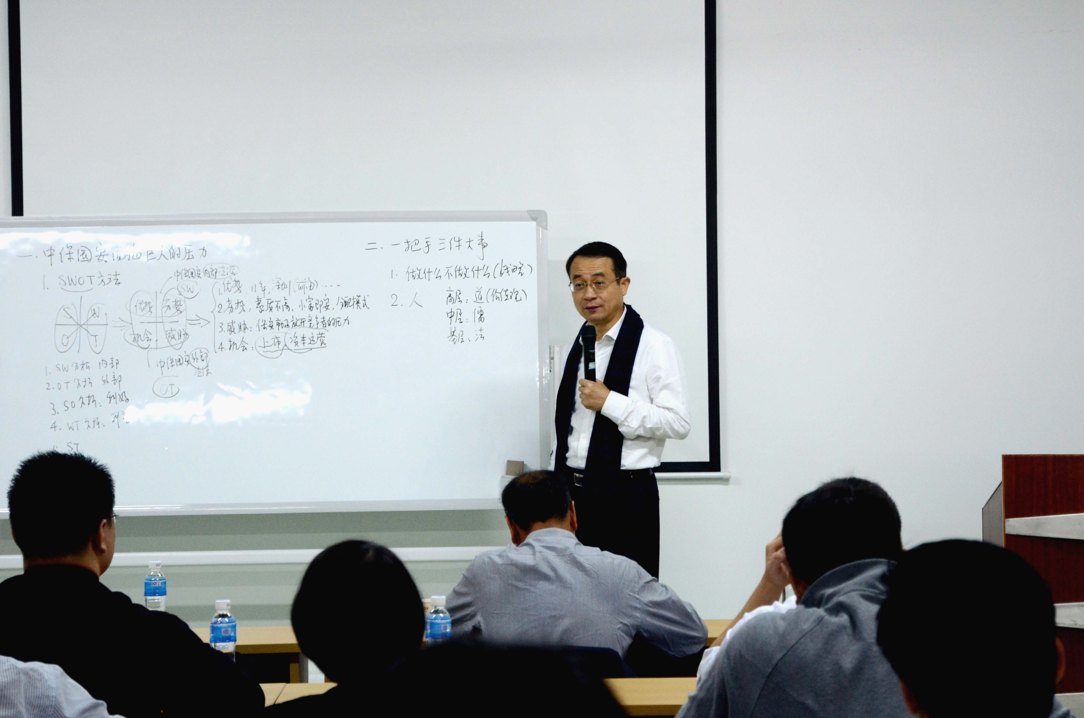 一是中保国安面临的巨大压力。陈教授介绍了经济分析的“SWOT”方法,详尽分析了中保国安自身的“优势、劣势”,分析了在发展中将面临的“机会、威胁”。
