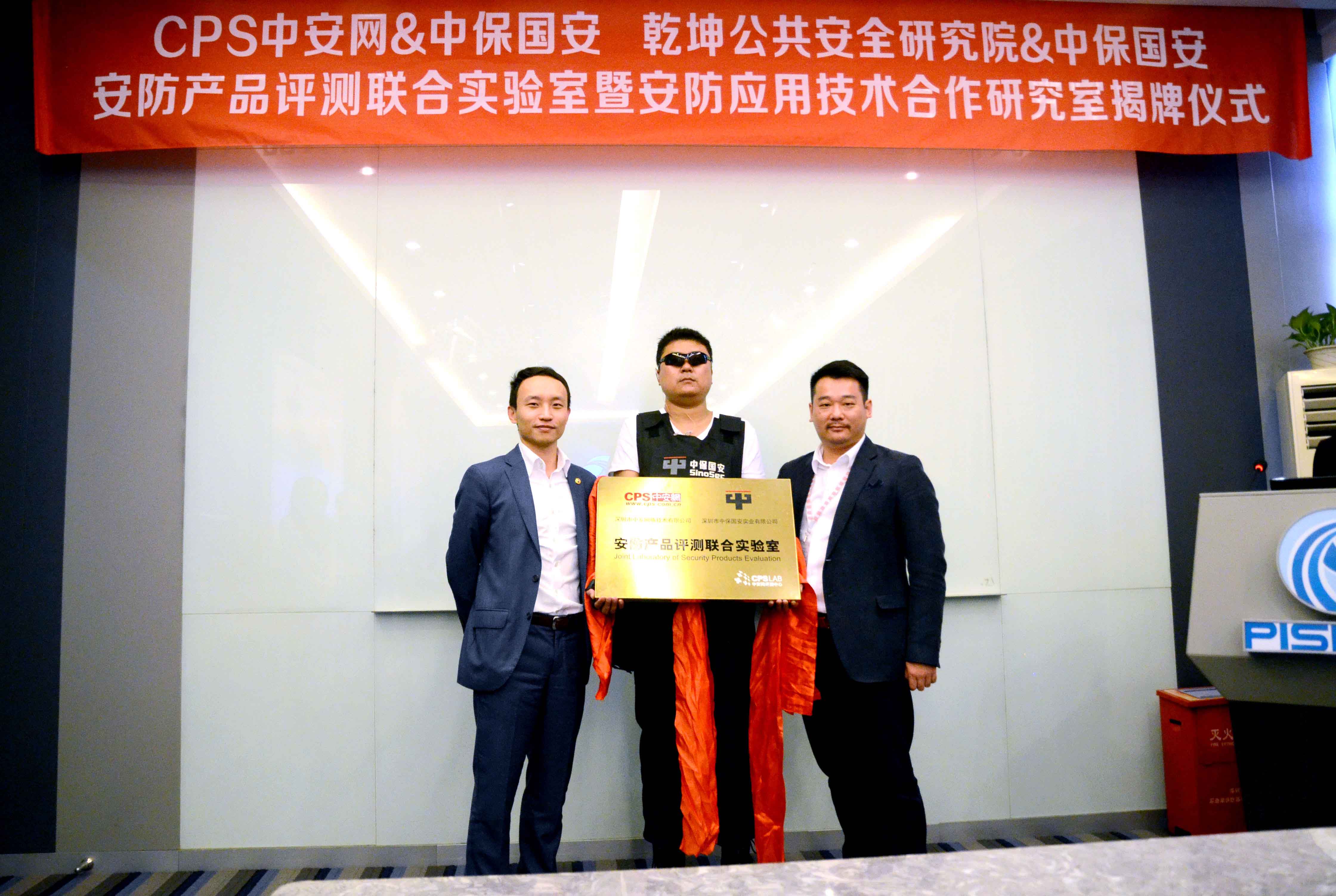 中保比讯总经理冯剑章代表集团公司与CPS中安网总经理杨鹏为“安防产品评测联合实验室”揭牌。