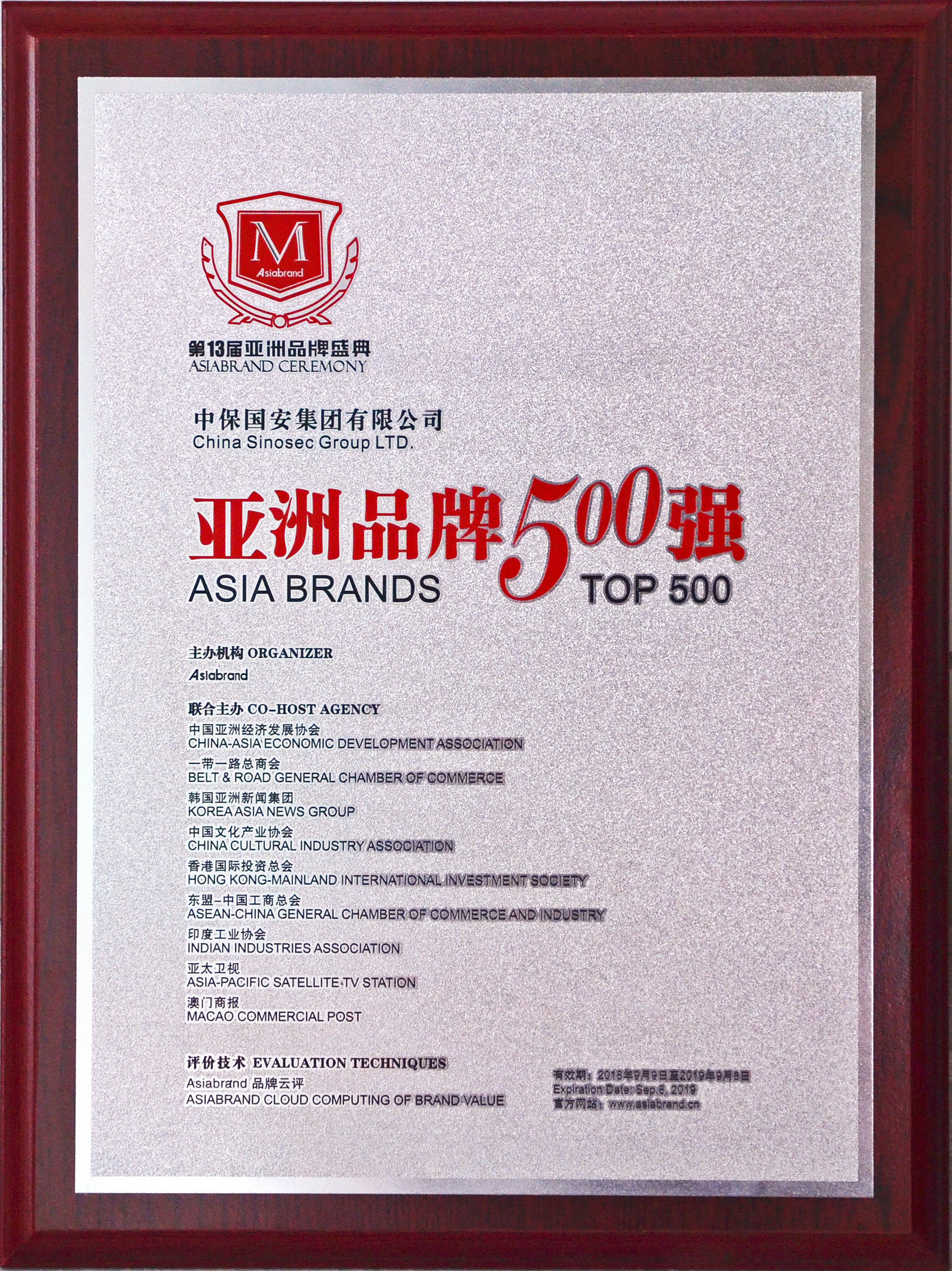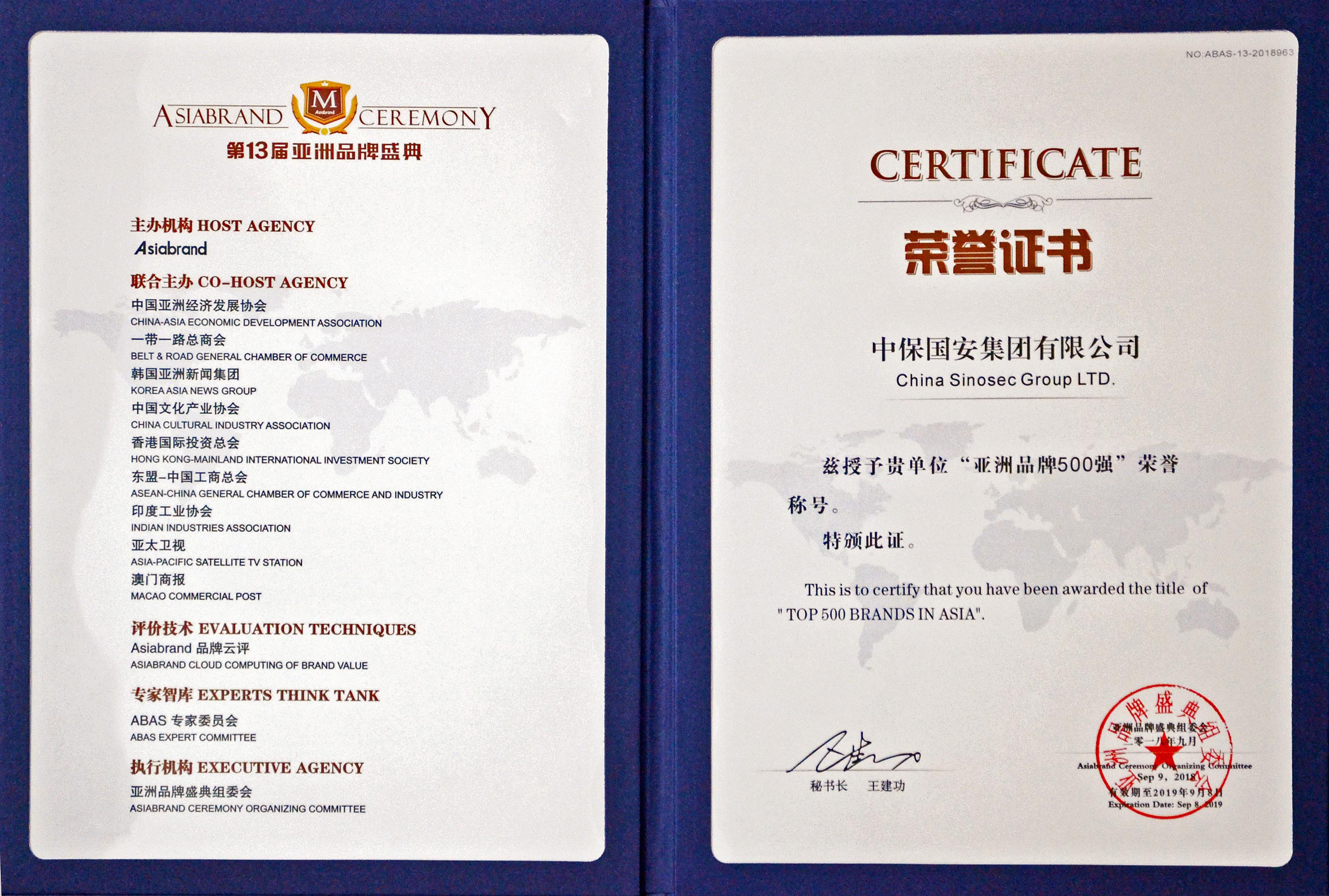 2018年9月9日,第13届亚洲品牌盛典在香港隆重举行,揭晓了亚洲品牌500强排行榜榜单,来自22个国家和地区、40个行业的500个品牌入选。中保国安集团以行业领先的发展规模、营业收入、品牌价值和公众形象等综合实力,荣列亚洲品牌500强,成为唯一上榜的保安服务公司。