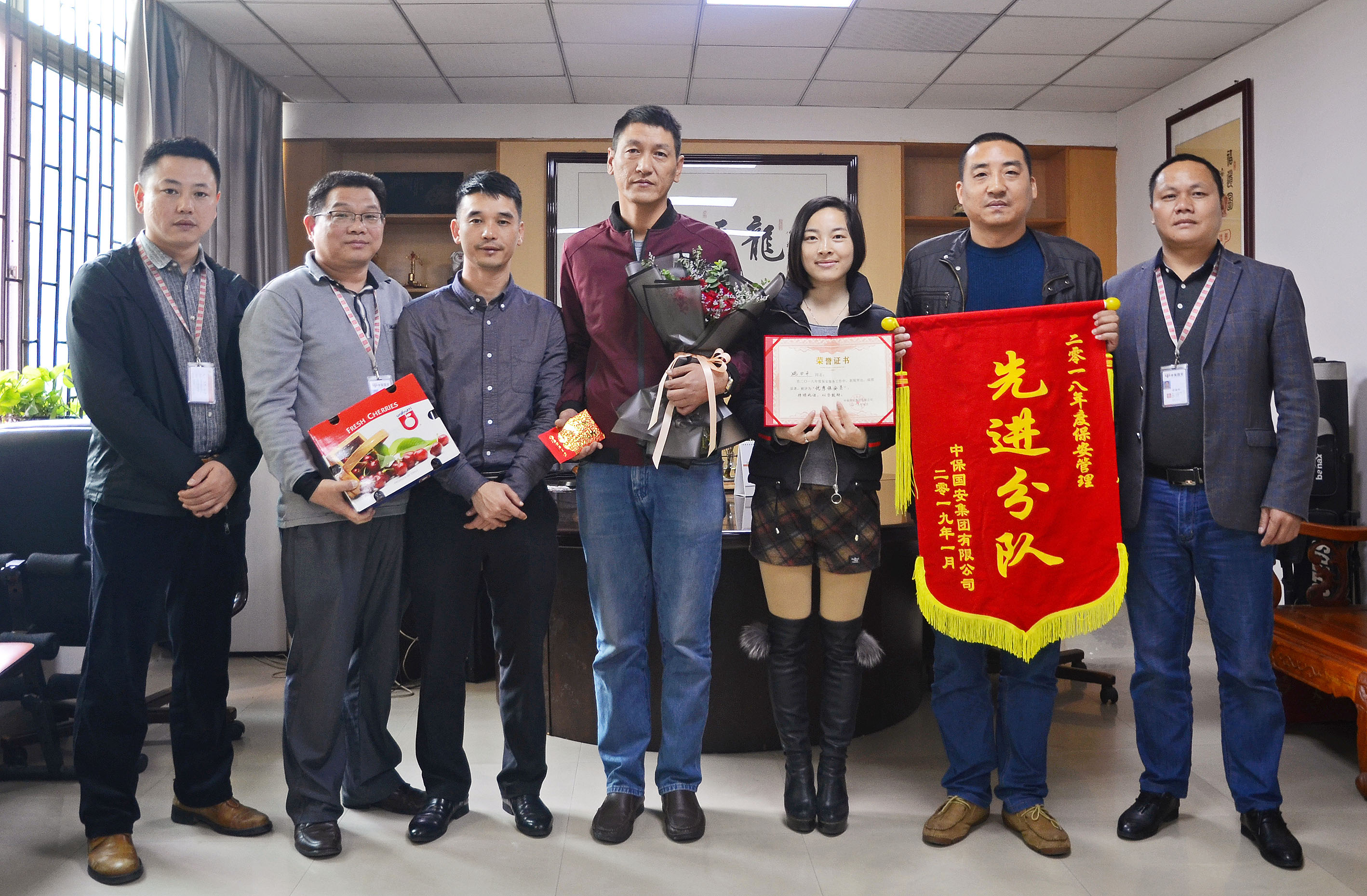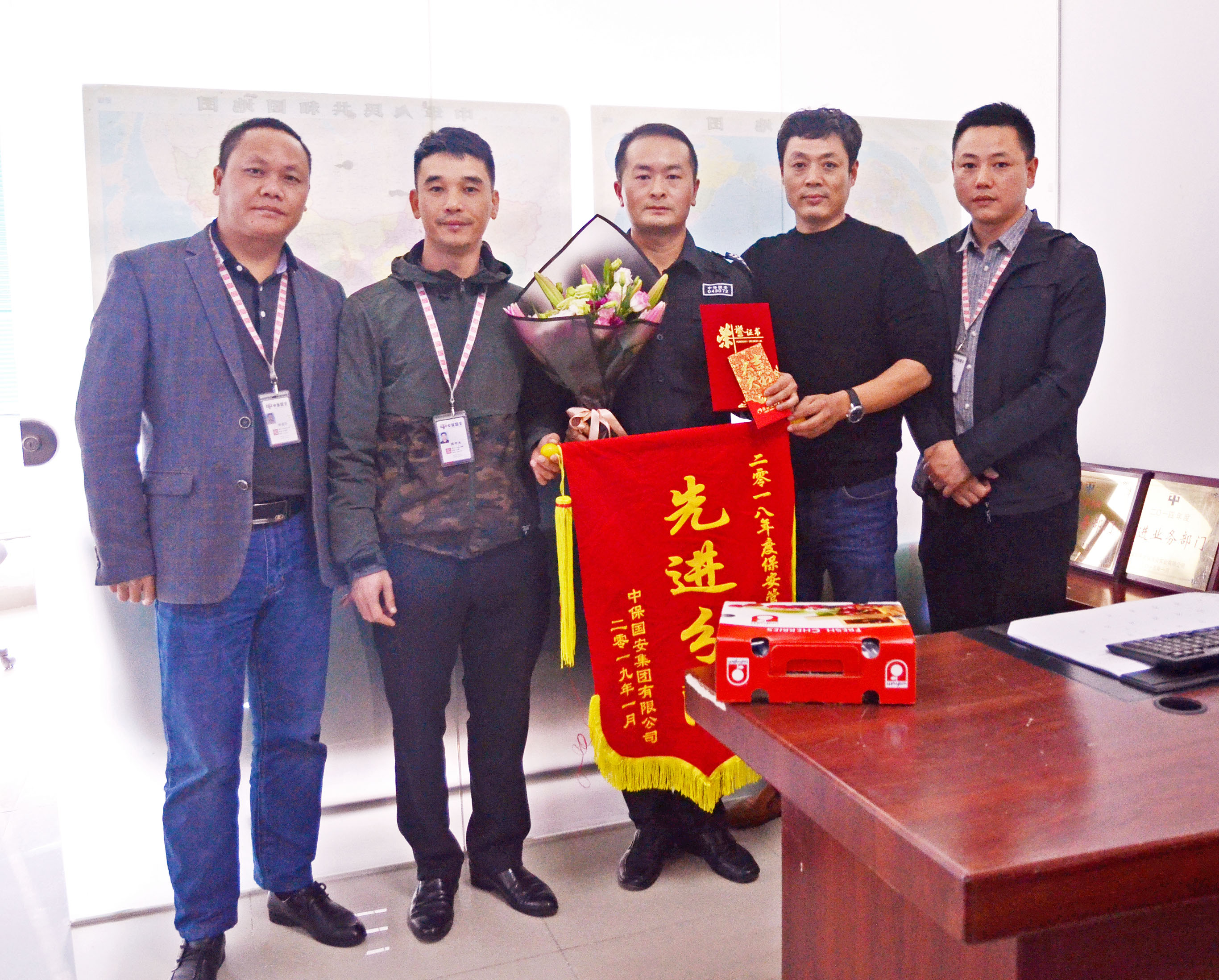 集团公司行政人事部、监察室、中龙分公司派员慰问两次因公负伤致左脚脚踝、脚跟先后骨折,多次立功,深受客户信赖,并被评为“2018年度优秀保安队长”的中龙分公司二十二大队队长曾燃明。