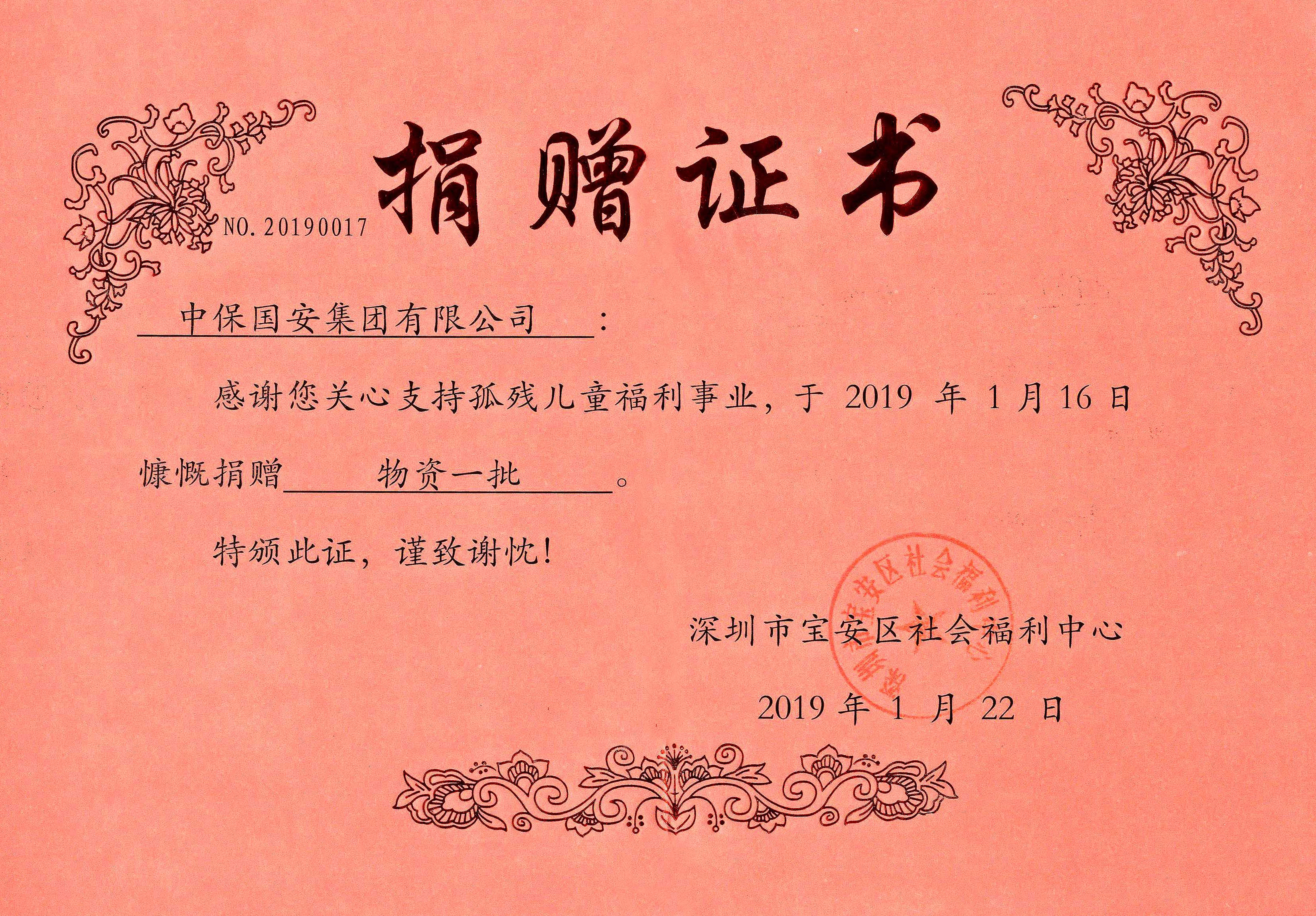 中保国安集团历来十分重视员工发展、关心基层员工,实行人性化管理。此外,集团公司积极参与社会公益事业,曾先后组织为四川汶川地震灾区、青海玉树地震灾区、四川雅安地震灾区、西藏30余名孤儿、河源和平县革命老区、新疆和田地区沙漠化治理捐款,先后开展了捐建红军学校助学活动,“迎五四、献爱心”无偿献血公益活动、关爱敬老院老人等多项公益活动。