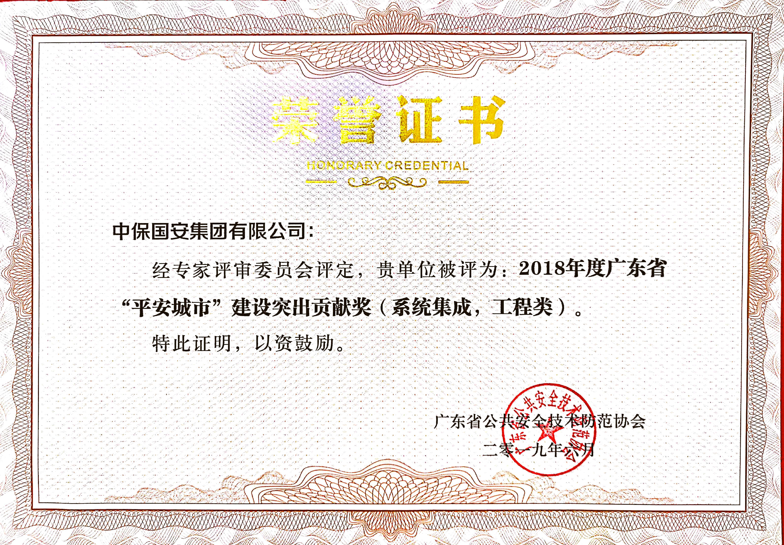 中保国安集团凭借在平安城市建设方面的突出贡献,被授予2018年度广东省“平安城市”建设突出贡献奖。