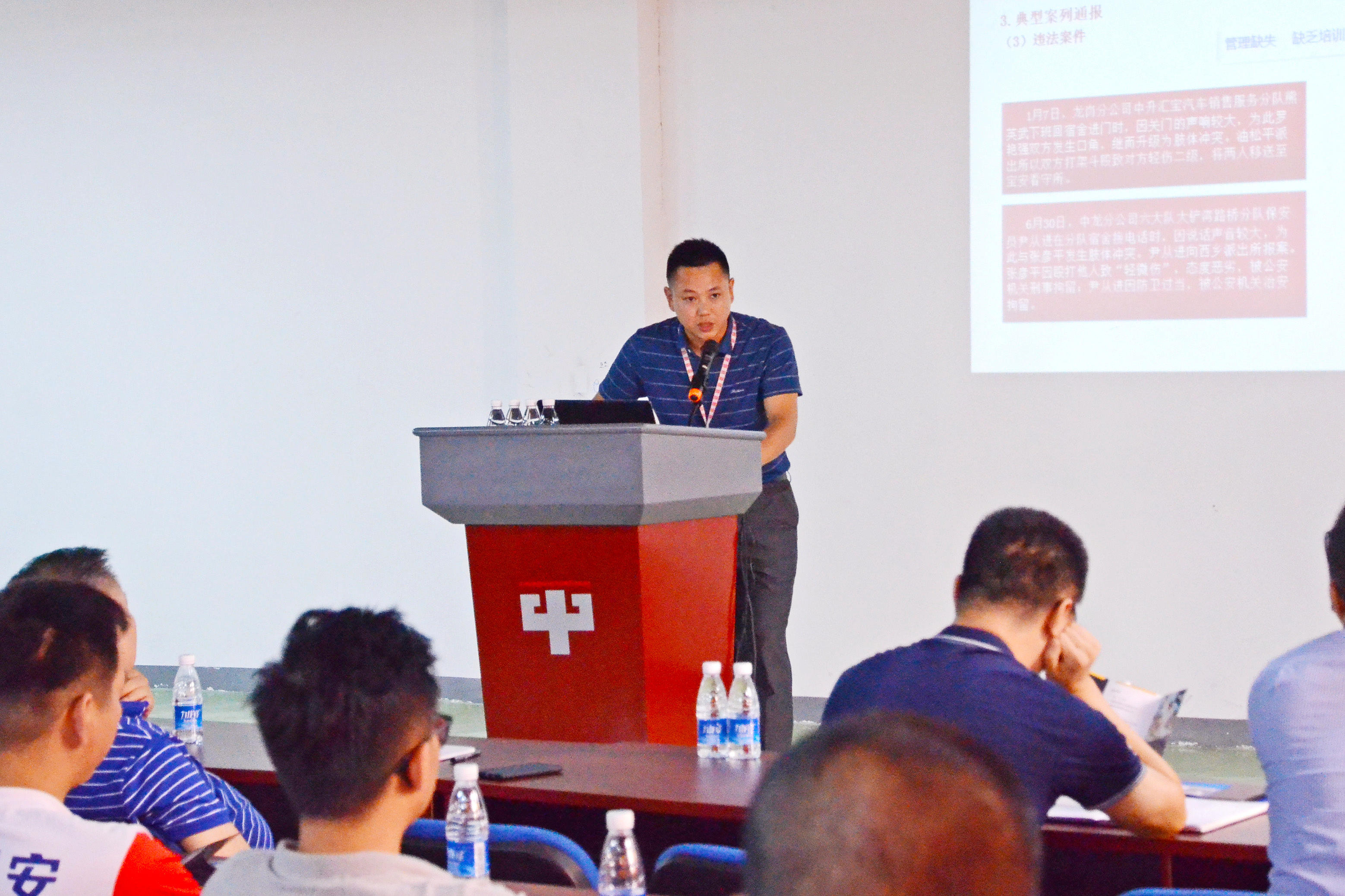 监察室副主任岳程总结了2019年上半年保安队伍管理情况,通报了保安违纪违规行为和典型案例,明确了“圳安”整治行动期间保安队伍纠察的重点内容,提出了“严把招聘入口关、加强队伍管理和培训、按要求考试办证、严格落实请示汇报制度”等六项工作建议。