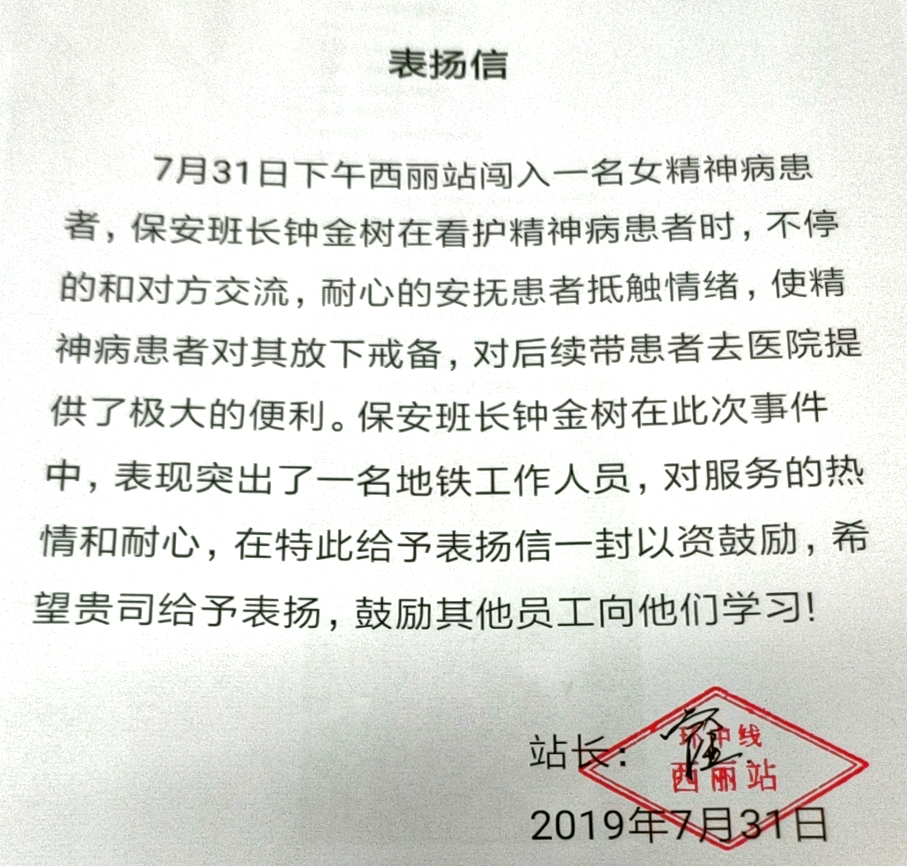 事后,女乘客家属来到车站,对工作人员、警务人员和保安人员当面致谢。地铁车站对驻点保安员对事情的妥善处理、热情服务和认真负责给予高度赞扬,还为公司寄来一封表扬信。